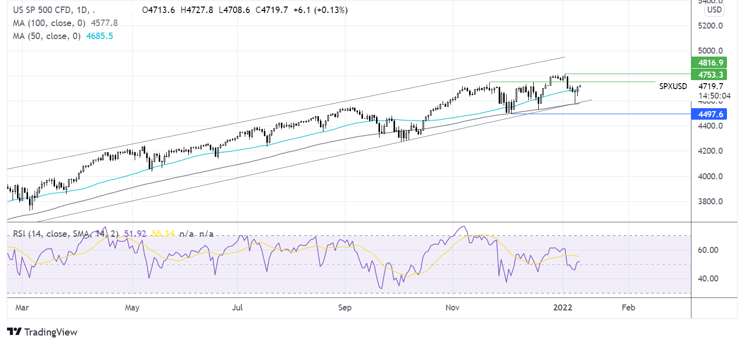 The S&P500 trades within a multi-month rising channel. It is extending the rebound off the 100 sma and the lower band of the channel and has re-taken its 50 sma in a bullish move. Buyers will be looking for a move over 4745 the November high, in order to attack 4817 and fresh all-time high. It would take a move below 4580, the year-to-date low, and 100 sma for sellers to gain traction.